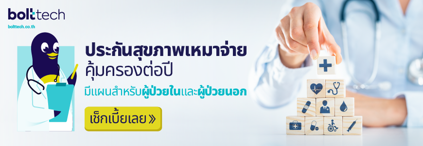 ซื้อประกันสุขภาพ ที่ bolttech.co.th เหมาจ่ายค่ารักษาตามจริง คุ้มครองต่อปี มีแผนให้เลือกทั้งผู้ป่วยในและผู้ป่วยนอก พร้อมรับสิทธิลดหย่อนภาษี ซื้อได้ตั้งแต่อายุ 21-55 ปี ยิ่งอายุน้อยเบี้ยยิ่งถูก